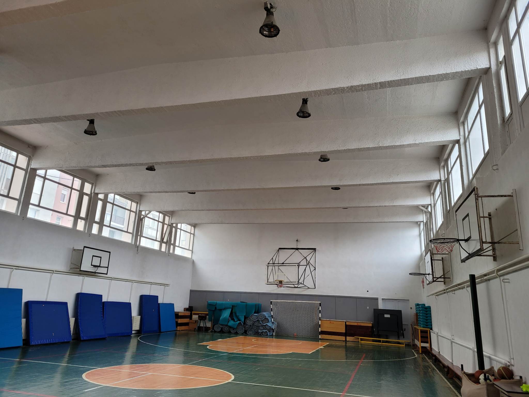 Sala de sport este rezervată copiilor care frecventează școala, care au ore de gimnastică în clădire.